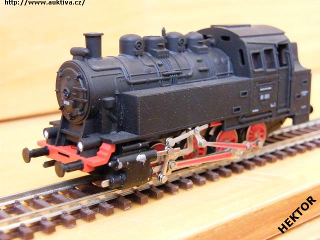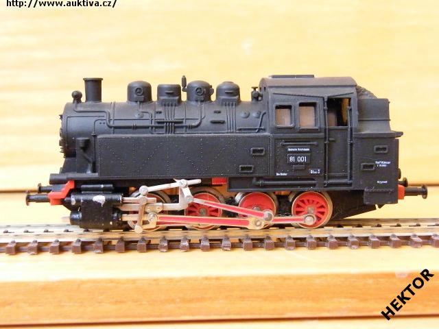 Sběratelský model parní lokomotivy BR 81 001, DR, černý, logo a číslo tištěno bílou, popisy tištěny bílou, rám umělohmotný černý, čelníky umělohmotné červené, výrobcem Zeuke + BTTB v 70. letech, kat. č. 2110. Výměnná spřáhla a umělohmotné nárazníky. Po zakoupení byl model odložen a pouze několikrát projet, je dlouho neježděn. Bez originální krabičky.