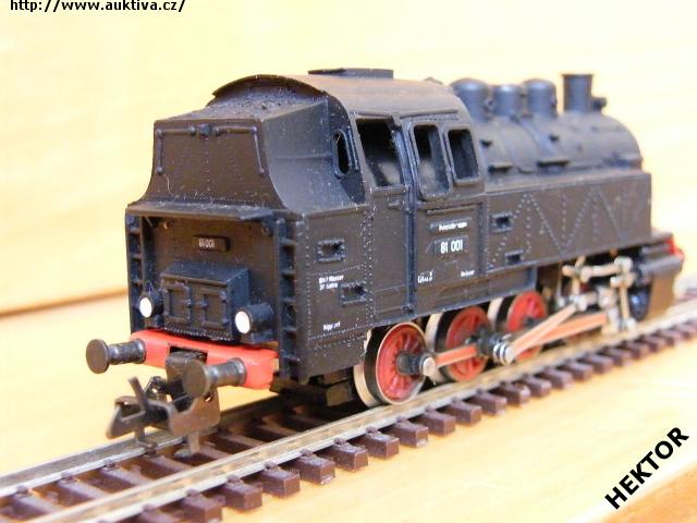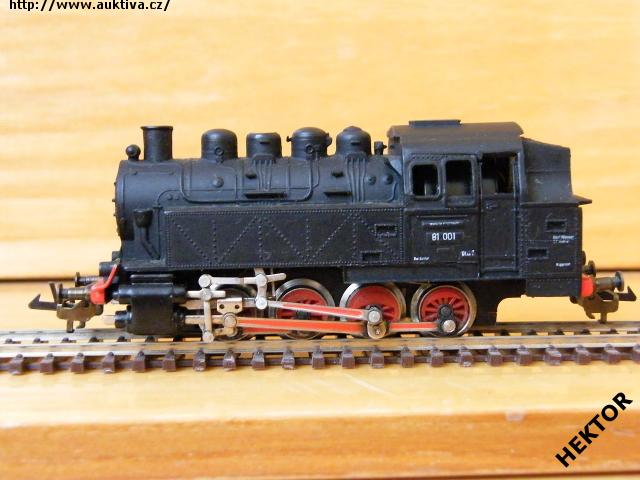 Sběratelský model parní lokomotivy BR 81 001, DR, černý, logo a číslo tištěno bílou, popisy tištěny bílou, rám kovový černý,čelníky kovové červené, dvojkolí loukoťová červená, výrobcem Zeuke v 60. letech, kat. č. 04/51. Pevná spřáhla Zeuke černá a kovové nárazníky černé. Po zakoupení byl model odložen a pouze několikrát projet, je dlouho neježděn. Bez originální krabičky.