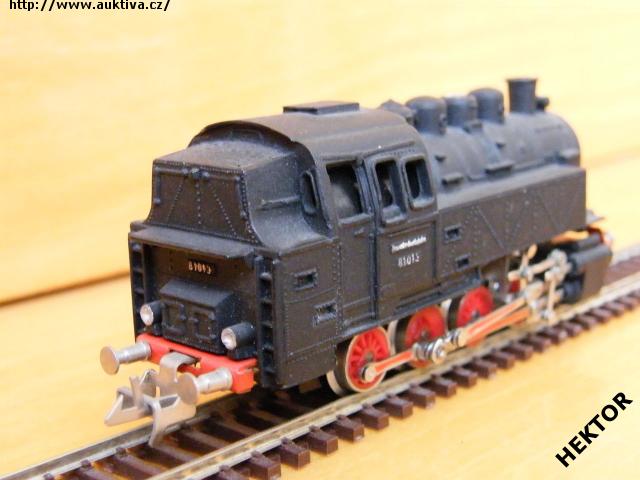 Sběratelský model parní lokomotivy BR 81 013, DR, černý, logo a číslo lisované obtažené stříbrnou, rám kovový stříbrný, čelníky kovové červené, dvojkolí loukoťová červená, výrobcem Zeuke koncem 50. let, kat. č. 159/51. Pevná spřáhla Zeuke stříbrná a nárazníky kovové stříbrné. Po zakoupení byl model odložen a pouze několikrát projet, je dlouho neježděn. Bez originální krabičky.
