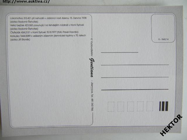 Česká barevná pohlednice – 115 let lokálky Martinice v Krkonoších – Jilemnice – Rokytnice nad Jizerou – 1899 – 2014 – 4 obrázky – parní lokomotiva 313.421 při nehodě v Jablonci nad Jizerou dne 15. 6. 1938 + parní lokomotiva 423.065 Velký bejček na nádraží v Horní Sytové + parní lokomotiva čtyřkolák 434.2137 v Horní Sytové dne 15. 10. 1977 + T 444.0089 Karkulka v Jilemnické topírně v 70. letech. Nová nepoužitá. Cena je za 1 kus.