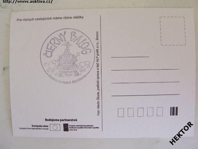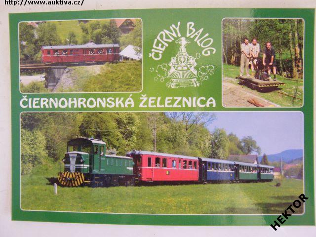Slovenská barevná pohlednice – 3 fotky úzkorozchodného motorového vozu a dieselové lokomotivy a drezíny na tratích Čiernohronské železnice s razítkem z Čierného Balogu. Nová nepoužitá. Cena je za 1 kus.