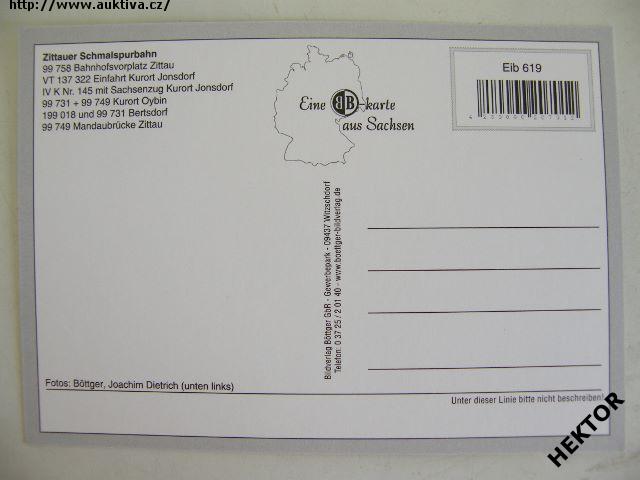 Německá barevná pohlednice – 7 obrázků různých parních a dieselových lokomotiv a motorového vozu na Žitavské úzkorozchodné železnici. Nová, nepoužitá. Cena je za 1 kus.