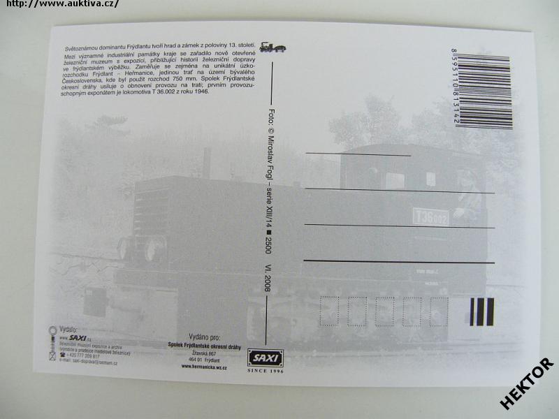 Česká barevná pohlednice - dieselová úzkorozchodná lokomotiva T 36.002 v Železničním muzeu Frýdlant. Nová nepoužitá. Cena je za 1 kus.