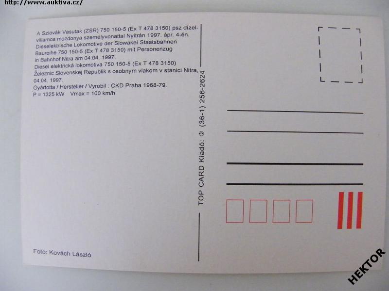Maďarská barevná pohlednice - dieselová lokomotiva 750.150-5 (ex. T 478.3150) ŽSR s osobním vlakem ve stanici Nitra dne 4. 4. 1997. Nová nepoužitá. Cena je za 1 kus.