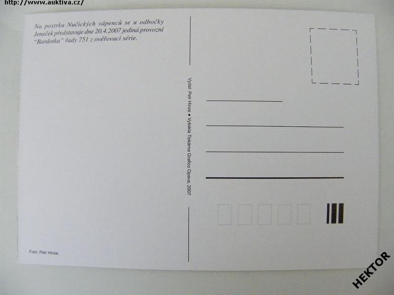 Česká barevná pohlednice - dieselová lokomotiva 751.004-3 (jediná provozní z ověřovací série) na postrku Nučických vápenců u odbočky Jeneček dne 20. 4. 2007. Nová nepoužitá. Cena je za 1 kus.