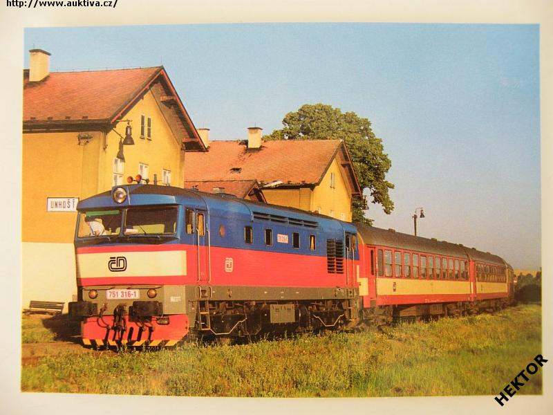 Česká barevná pohlednice - dieselová lokomotiva 751.316-1 ČD s osobním vlakem projíždí stanicí Unhošť dne 24. 7. 1999. Nová nepoužitá. Cena je za 1 kus.