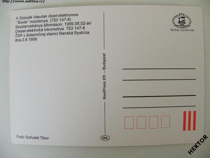 Maďarská barevná pohlednice - dieselová lokomotiva 753.147-8 ŽSR v železniční stanici Banská Bystrica dne 2. 8. 1999. Nová nepoužitá. Cena je za 1 kus.