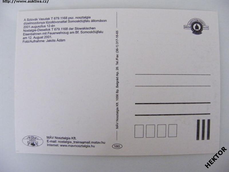 Maďarská barevná pohlednice - dieselová lokomotiva - T 679.1168 ŽSR s nostalgickým vlakem na nádraží Somoskoújfalu dne 12. 8. 2001. Nová nepoužitá. Cena je za 1 kus.