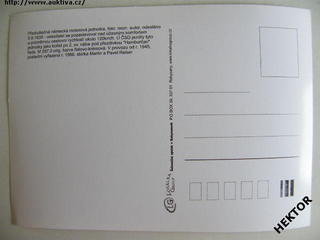 Česká černobílá pohlednice - motorová jednotka Hamburčan u ČSD jako kořistní po 2. světové válce pod řadou M 297.0 - poslední vyřazena roku 1966. Nová nepoužitá. Cena je za 1 kus.