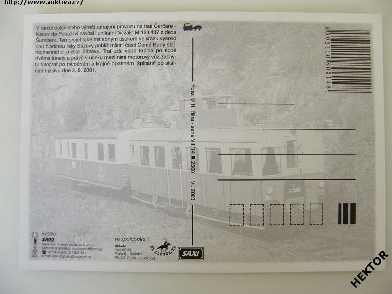 Česká barevná pohlednice - motorový vůz M 120.437 ČSD - zvaný Věžák - s přívěsným vozem - při 100. výročí trati Čerčany - Kácov dne 3. 8. 2001. Nová nepoužitá. Cena je za 1 kus.