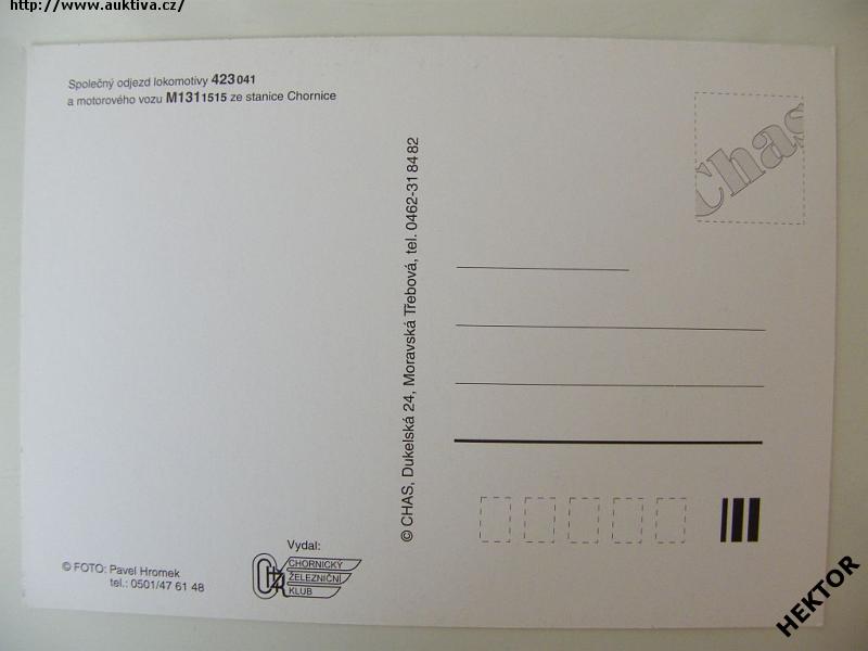 Česká barevná pohlednice - společný odjezd parní lokomotivy 423.041 ČSD s osobním vlakem a motorového vozu M 131.1515 ČSD ze stanice Chornice. Nová nepoužitá. Cena je za 1 kus.