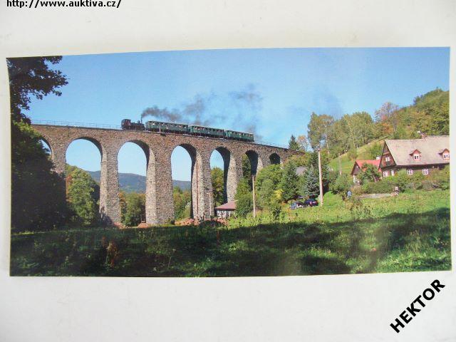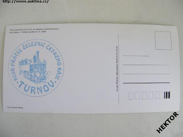 Česká široká barevná pohlednice – Parní lokomotiva 310.0134 ČSD s osobním vlakem na viaduktu u zastávky Novina na trati Liberec – Česká Lípa dne 23. září 2006. Nová, nepoužitá. Cena je za 1 kus.