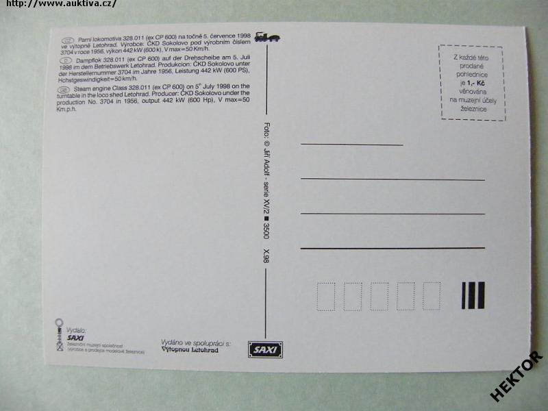 Česká barevná pohlednice - parní lokomotiva 328.011 (CP 600) na točně v depu Letohrad v noci dne 5. 7. 1998 - noční fotka. Nová nepoužitá. Cena je za 1 kus.