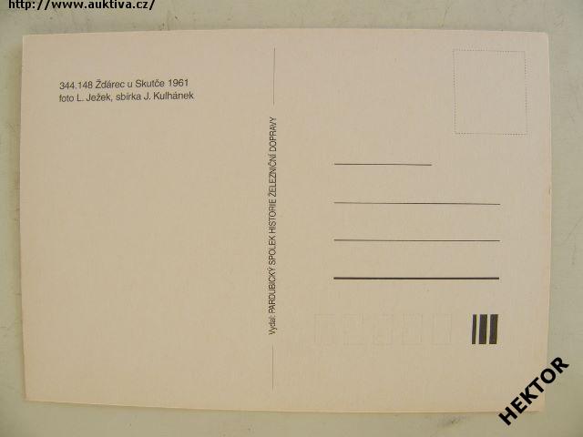 Česká černobílá pohlednice - parní lokomotiva 344.148 ČSD ve Žďárci u Skutče v roce 1961. Nová nepoužitá. Cena je za 1 kus.