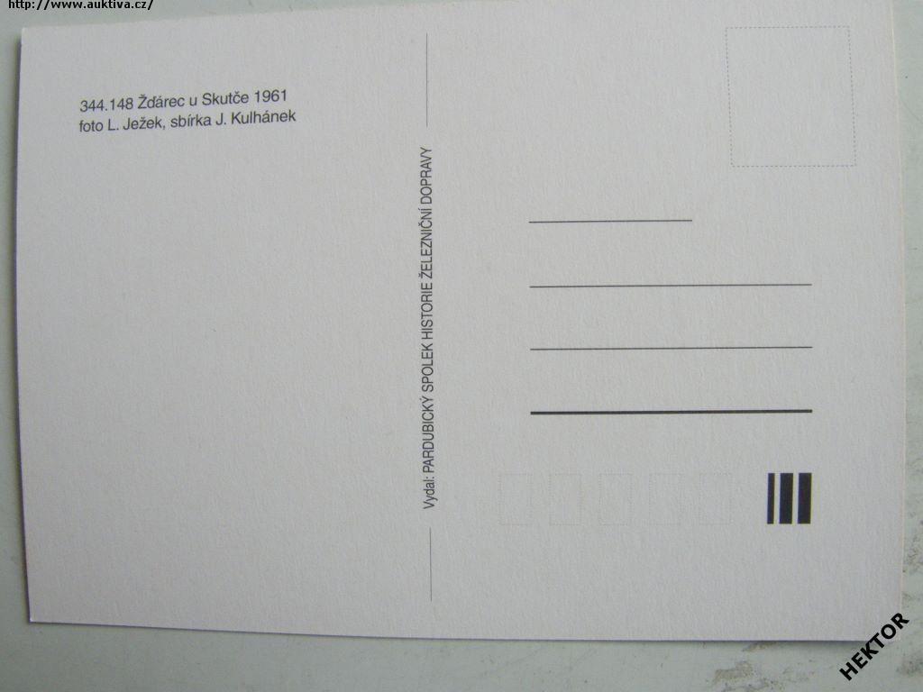 Česká černobílá pohlednice – parní lokomotiva 344.148 ČSD ve Žďárci u Skutče – 1961. Nová nepoužitá. Cena je za 1 kus.