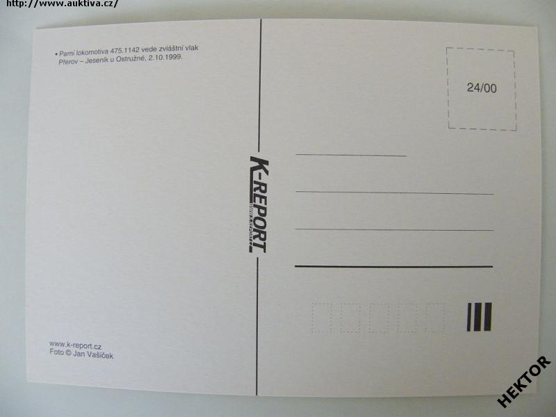Česká barevná pohlednice - parní lokomotiva 475.1142 ČSD - NTM Praha s osobním vlakem u Ostružné na trati Přerov - Jeseník dne 2. 10. 1999. Nová nepoužitá. Cena je za 1 kus.