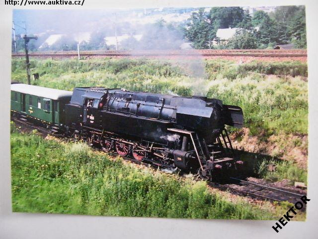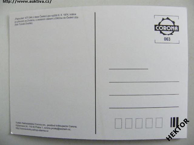 Česká barevná pohlednice – parní lokomotiva 477.044 z depa Česká Lípa s osobním vlakem z Děčína do České Lípy dne 6. 8. 1974. Nová nepoužitá. Cena je za 1 kus.