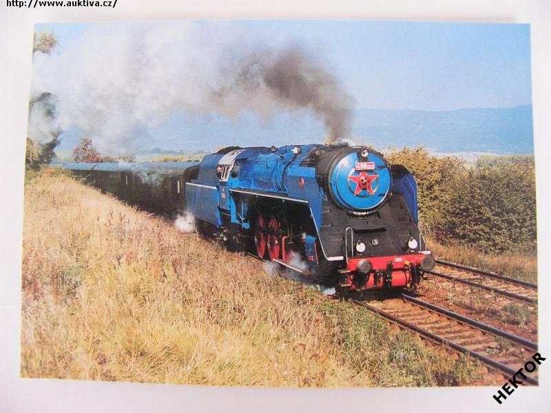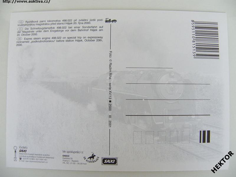 Česká barevná pohlednice - rychlíková parní lokomotiva 498.022 ČSD (ČD) nazývaná ALBATROS s osobním vlakem před stanicí Hájek dne 20. 10. 2000. Nová nepoužitá. Cena je za 1 kus.