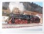 Slovenská barevná pohlednice - rychlíkové parní lokomotivy 498.104 ČSD (ŽSR) s tendrem 935.2284 v majetku MDC Bratislava nazývané ALBATROS ve stanici Murzzuschlag ŐBB dne 6. 1. 2001. Nová nepoužitá. Cena je za 1 kus.