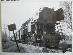 Česká černobílá pohlednice – parní lokomotiva 477.003 v Bystrovanech na trati Olomouc – Krnov dne 14. 4. 1974. Nová nepoužitá. Cena je za 1 kus.