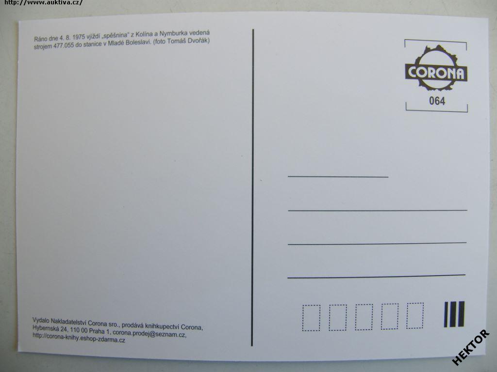 Česká barevná pohlednice – parní lokomotiva 477.055 vjíždí do stanice Mladá Boleslav dne 4. 8. 1975. Nová nepoužitá. Cena je za 1 kus.