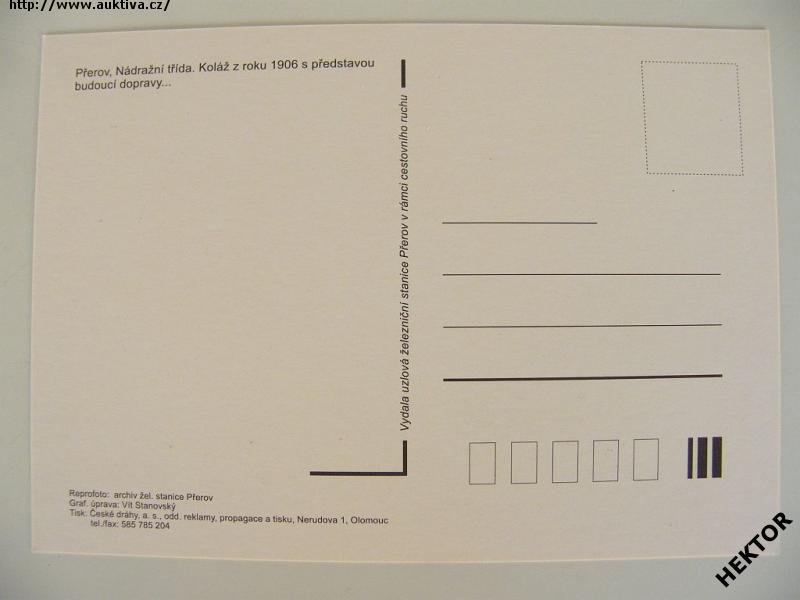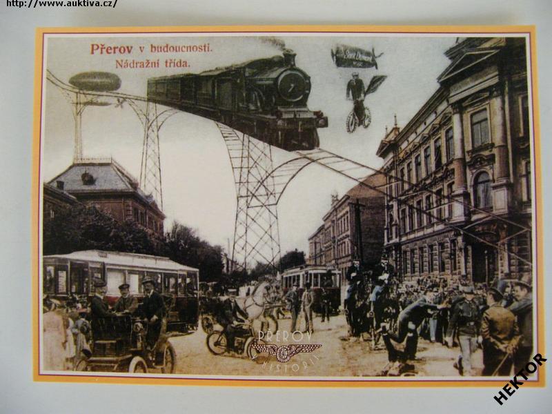 Česká černobílá pohlednice - Přerov - Nádražní třída. Koláž z roku 1906 s představou budoucí dopravy - Přerov v historii. Nová nepoužitá. Cena je za 1 kus.