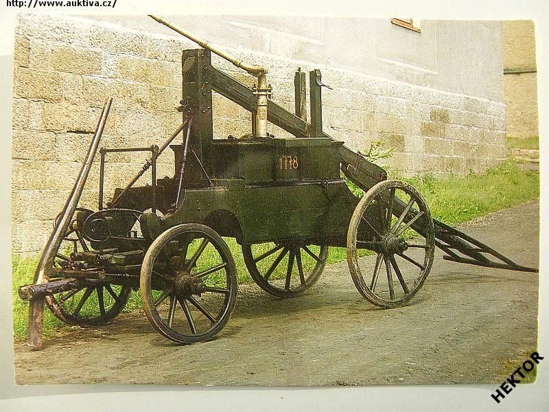 Československá barevná pohlednice - Stará požární technika - koněspřežná ruční stříkačka z roku 1778. Nová nepoužitá. Cena je za 1 kus.