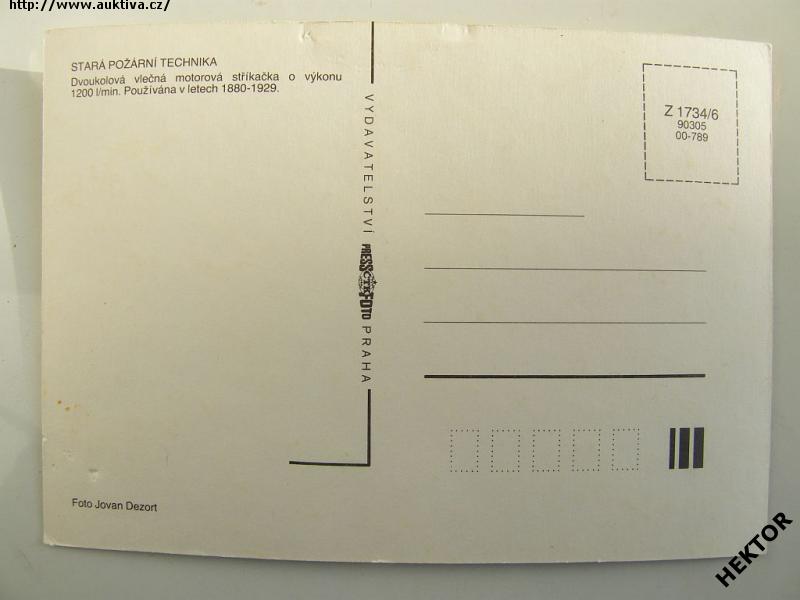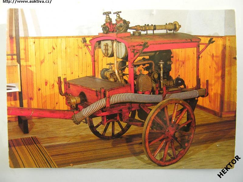 Československá barevná pohlednice - Stará požární technika - dvoukolová motorová stříkačka používaná v letech 1880 - 1929. Nová nepoužitá. Cena je za 1 kus.
