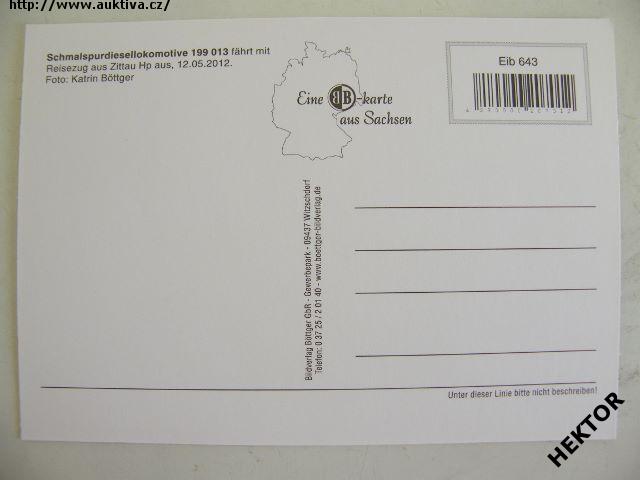Německá barevná pohlednice – úzkorozchodná dieselová lokomotiva 199 013 s osobním vlakem projíždí Žitavou dne 12. května 2012. Nová, nepoužitá. Cena je za 1 kus.