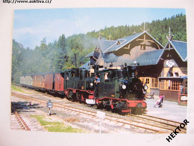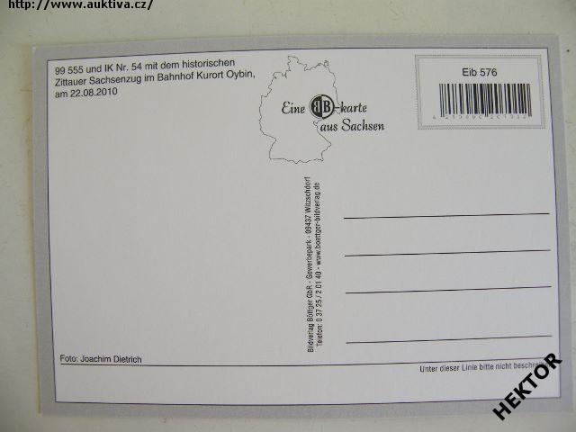 Německá barevná pohlednice – úzkorozchodné parní lokomotivy 99 555 a IK č. 54 přijely s osobním vlakem na nádraží Kurort Oybin dne 22. srpna 2010. Nová, nepoužitá. Cena je za 1 kus.