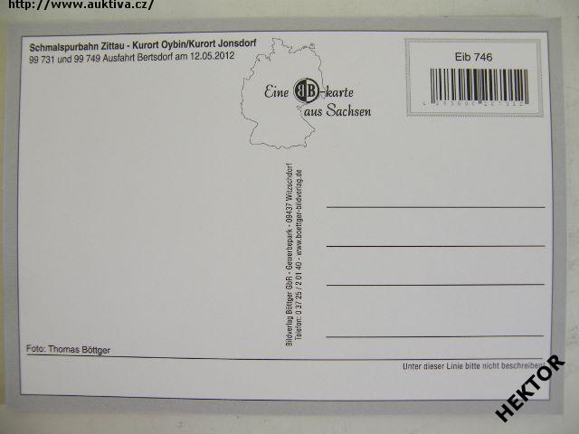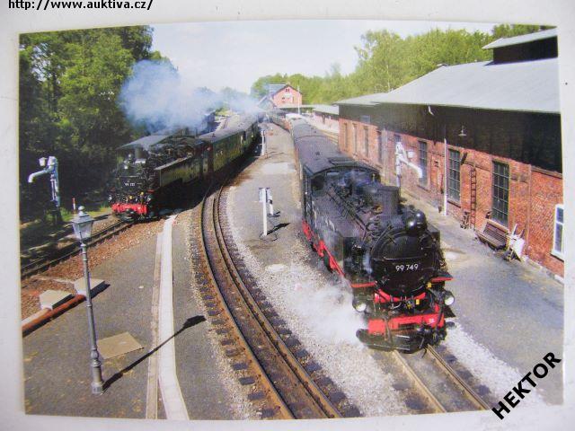 Německá barevná pohlednice – úzkorozchodné parní lokomotivy 99 731 + 99 749 s osobními vlaky odjíždí z nádraží Bertsdorf. Nová, nepoužitá. Cena je za 1 kus.