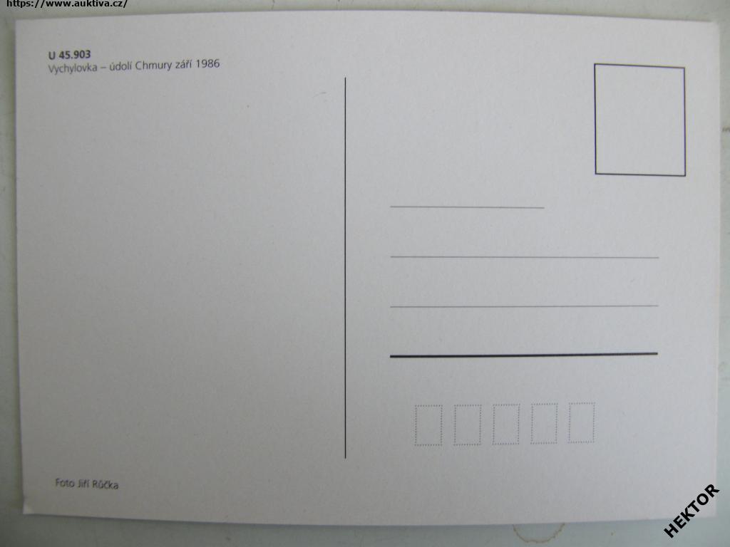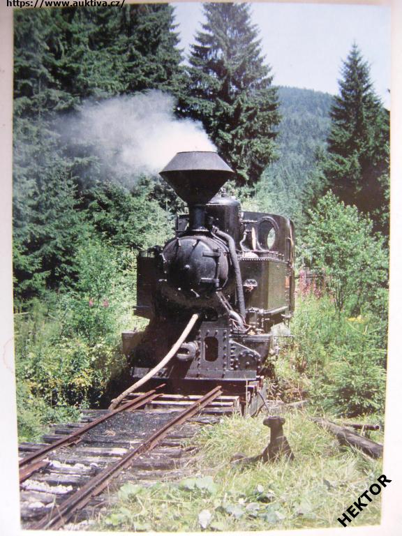 Česká barevná pohlednice – úzkorozchodné parní lokomotivy U 45.903, Vychylovka, údolí Chmury v září 1986. Nová nepoužitá. Cena je za 1 kus.