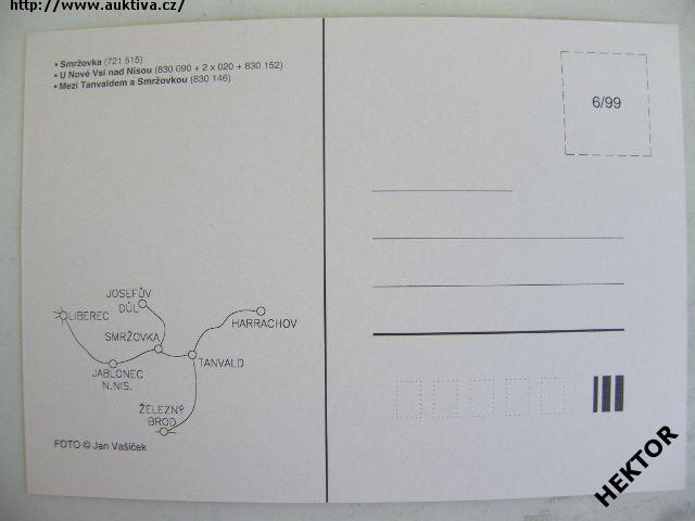 Česká barevná pohlednice – Železniční trať Liberec – Tanvald 3 různé obrázky dieselové lokomotivy řady 721 a motorových vozů řady 830 na uvedené trati. Nová, nepoužitá. Cena je za 1 kus.