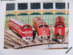 Maďarská pohlednice 3 dieselových lokomotiv M61.001 a M61.002 a M61.006 - MÁV - typu NOHAB na paprscích točny před depem ze dne 12. 1. 2001. Nová nepoužitá. Cena je za 1 kus.
