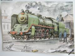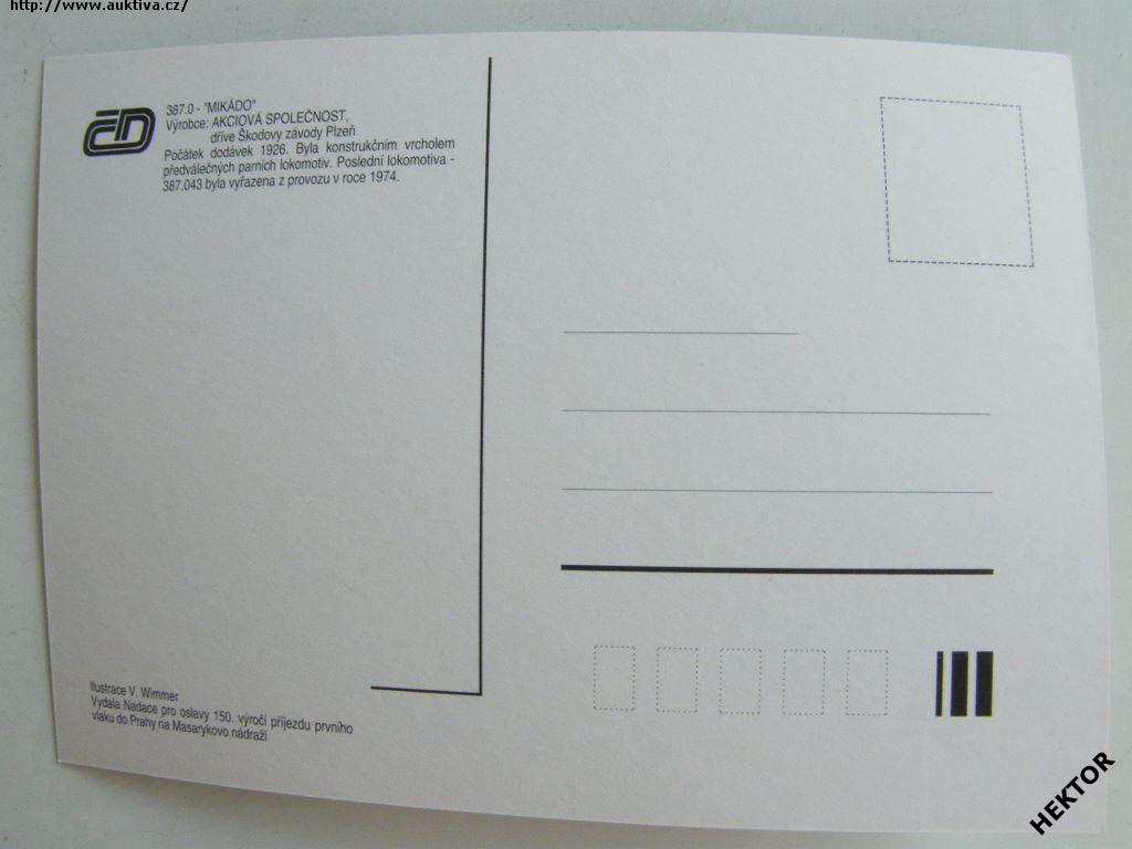 Česká barevná kreslená pohlednice – parní lokomotivy 387.0 „Mikádo“. Nová nepoužitá. Cena je za 1 kus.