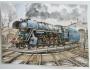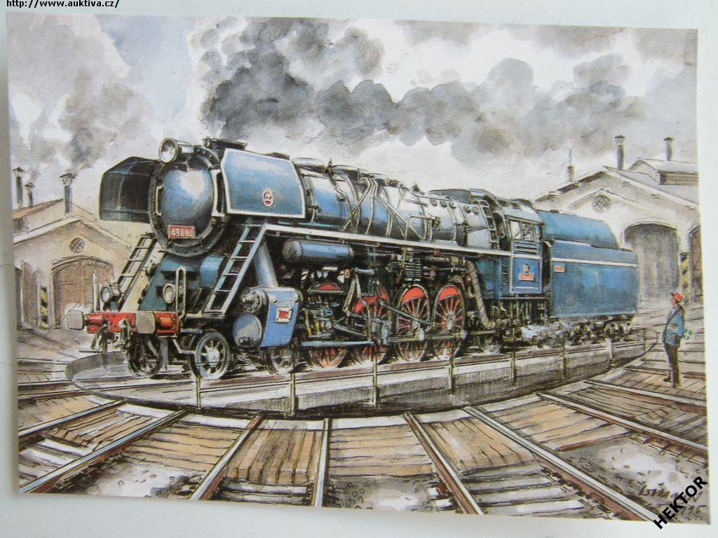 Česká barevná kreslená pohlednice – parní lokomotivy 498.1 „Albatros“ na točně. Nová nepoužitá. Cena je za 1 kus.