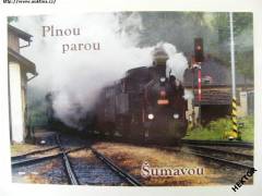 Česká barevná pohlednice parní lokomotivy 423.009 ČSD (ČD) s osobním vlakem - "Plnou parou Šumavou". Nová nepoužitá. Cena je za 1 kus.