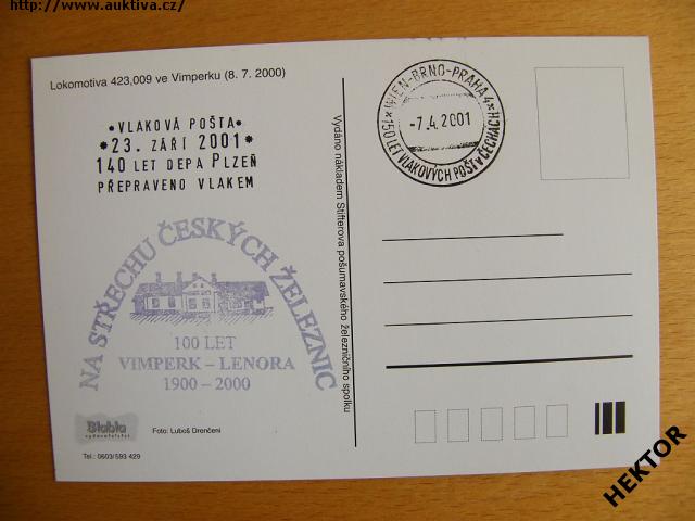 Česká barevná pohlednice barevná parní lokomotivy 423.009 ČSD (ČD) z roku 2001 se dvěmi pamětními razítky, přijíždí s osobním vlakem do Vimperku dne 8.7.2000. Nová nepoužitá. Cena je za 1 kus.