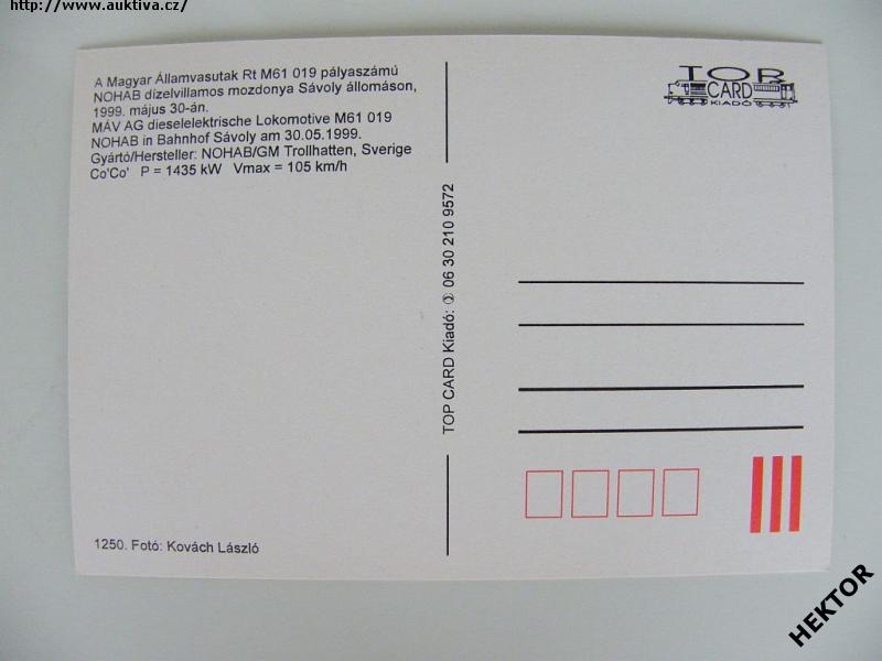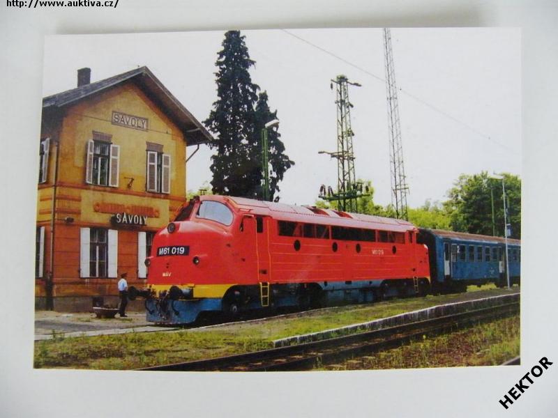 Maďarská pohlednice dieselové lokomotivy M61.019 - MÁV - typu NOHAB s osobním vlakem ve stanici Savoly dne 30. 5. 1999. Nová nepoužitá. Cena je za 1 kus.