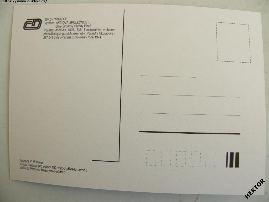 Česká kreslená barevná pohlednice – parní lokomotiva řady 387.0 ČSD s přezdívkou MIKÁDO. Nová nepoužitá. Cena je za 1 kus.