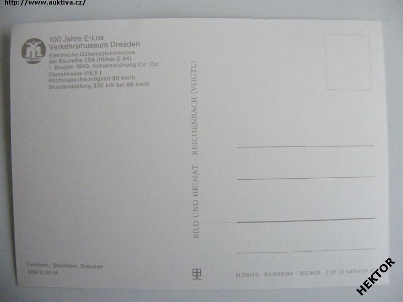Německá barevná pohlednice elektrické lokomotivy BR 254 DR - 100 Jahre E - Lok z dob hluboké totality. Nový nepoužitý. Cena je za 1 kus.