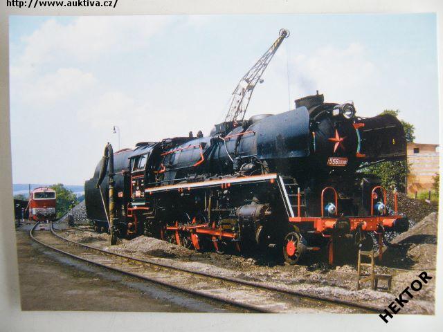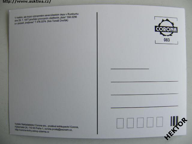 Česká barevná pohlednice – parní lokomotiva 556.0296 nazývaná Štokr a v pozadí dieselová lokomotiva T 478.3374 nazývaná Brejlovec v depu Rumburk dne 29. 7. 1977. Nová nepoužitá. Cena je za 1 kus.