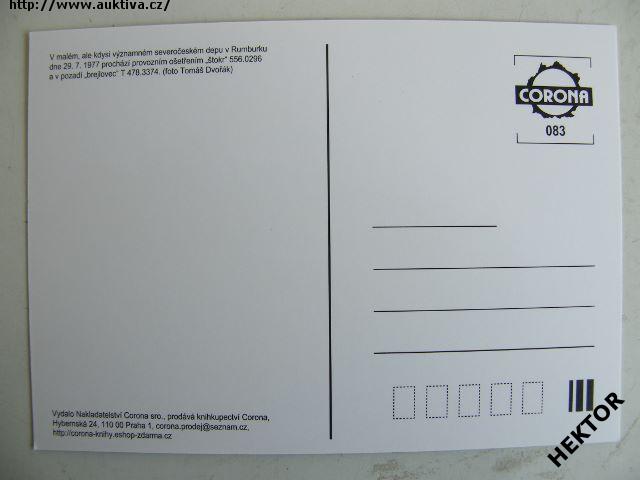 Česká barevná pohlednice – parní lokomotiva 556.0296 nazývaná Štokr z depa V České Lípě patřila k posledním provozním lokomotivám své řady, ve své domovské služebně z roku 1978. Nová nepoužitá. Cena je za 1 kus.