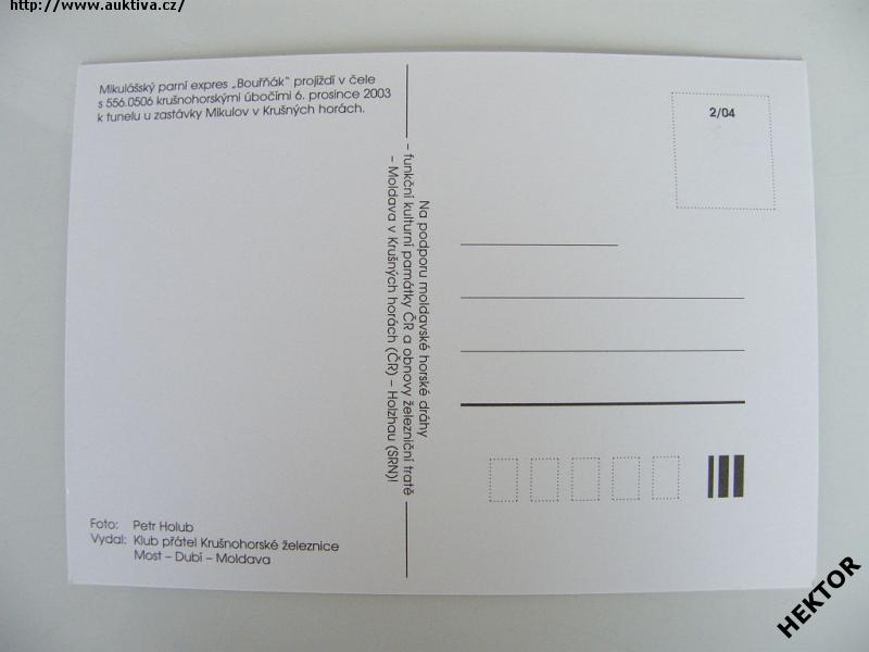 Česká barevná pohlednice parní lokomotivy řady 556.0506 s osobním vlakem Mikulášský expres přijíždí k tunelu u zastávky Mikulov v Krušných horách dne 6. 12. 2003. Nová nepoužitá. Cena je za 1 kus.