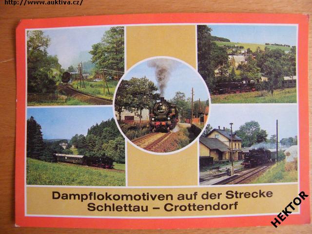 Německá barevná pohlednice parních lokomotiv DR na trati Schlettau - Crottendorf z roku 1985. Použitá. Cena je za 1 kus.