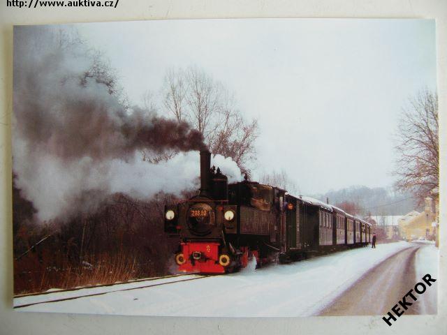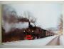 Rakouská barevná pohlednice – úzkorozchodná parní lokomotiva 298.53 ÖGEG s osobním vlakem dne 8. 12. 2001. Nová nepoužitá. Cena je za 1 kus.