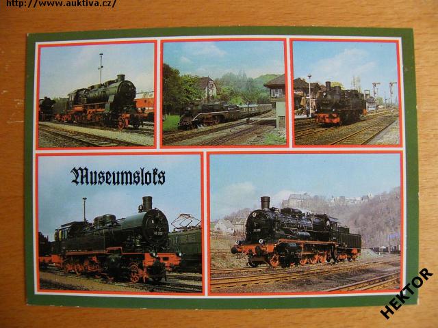 Německá barevná pohlednice různých muzeálních parních lokomotiv DR z roku 1985. Nová nepoužitá. Cena je za 1 kus.