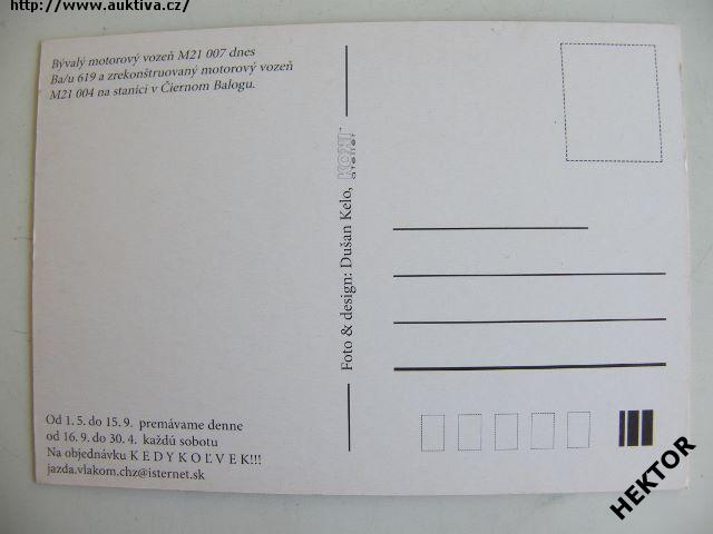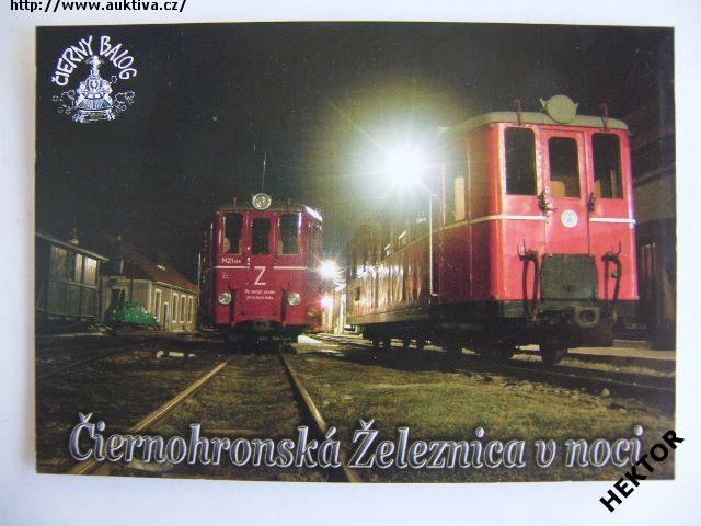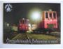 Slovenská barevná pohlednice – úzkorozchodného motorového vozu M 21.004 a bývalý úzkorozchodný motorový vůz M 21.007 předělaný na osobní vůz Ba/u 619 Černohronské lesní železnice – noční fotka. Nová nepoužitá. Cena je za 1 kus.
