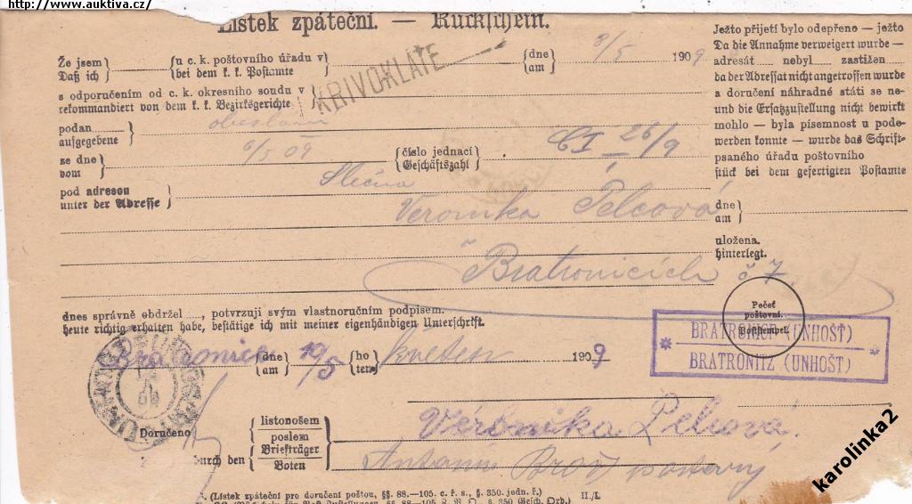 POŠTOVNA BRATRONICE=UNHOŠŤ=KŘIVOKLÁT=rok1909*c8374