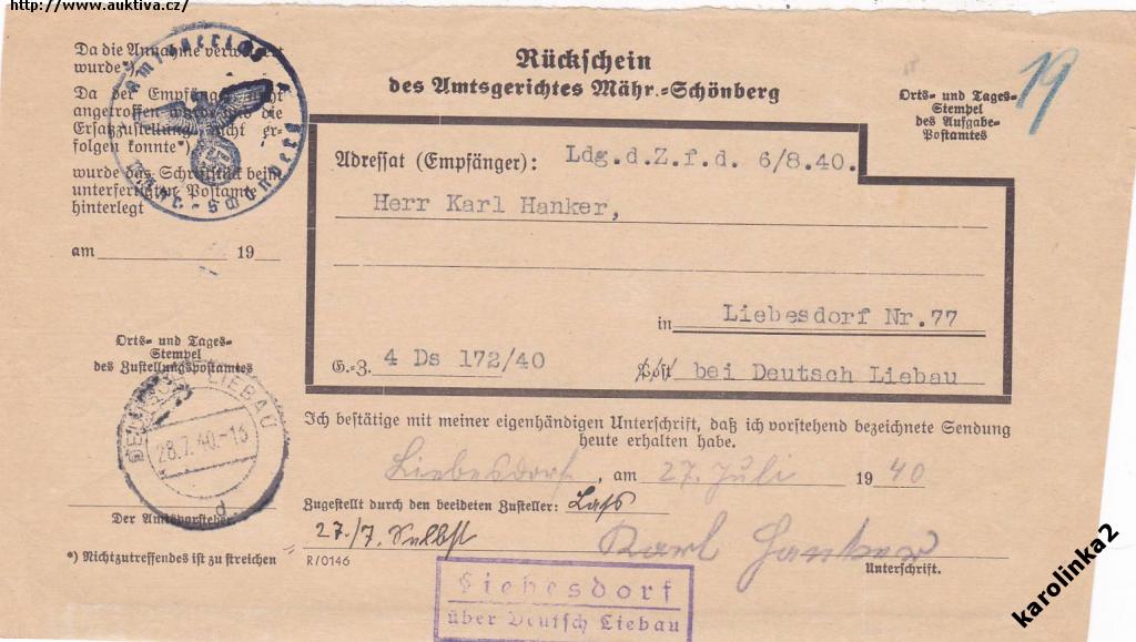 POŠTOVNA LIEBESDORF=LIBINA=ŠUMPERK /rok1940*c8238
